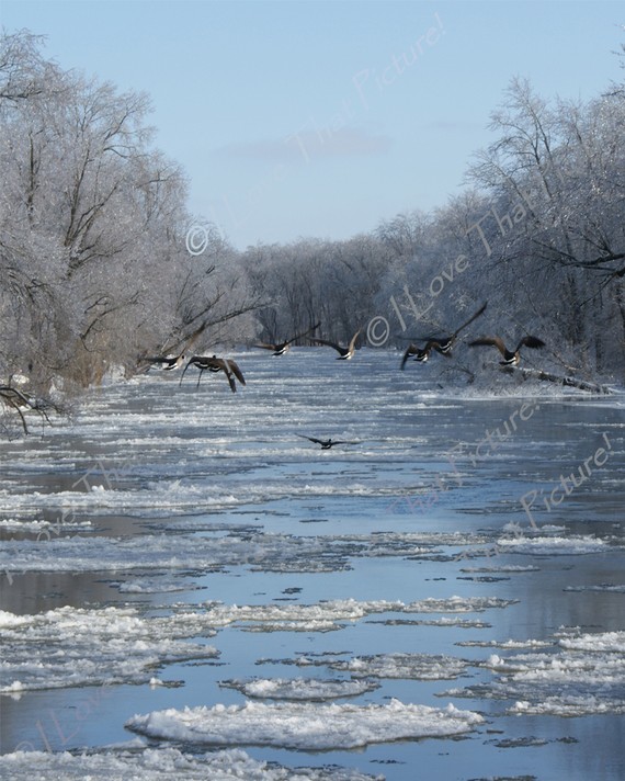 Geese flying down the Kankakee River in Indiana