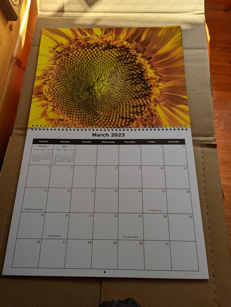 Look what UPS just brought me! My Sunflower 2023 Calendars! Use the Contact Us form at the bottom of this page to order yours TODAY! $40.00 plus $5.00 Shipping, They are 11×14 with Frameable photos on every page, that’s 12 11×14 Sunflower Photos!